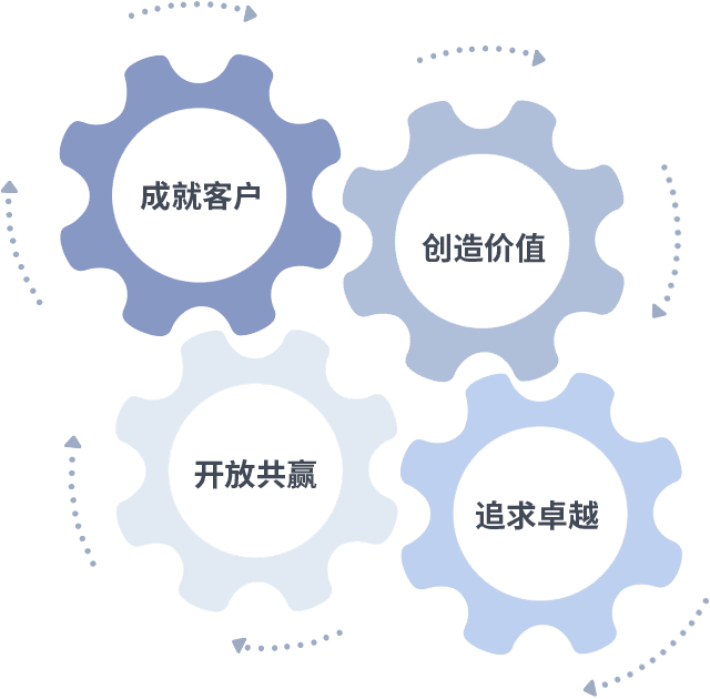 成就客户是一切决策的出发点,,,,创造价值是衡量所有工作的标准,,,追求卓越是我们做事做人的态度,,,开放共赢是我们的格局也是最终的结果。。。价值观的齿轮环环相扣,,,,推动着组织里的每个人不断向前。。