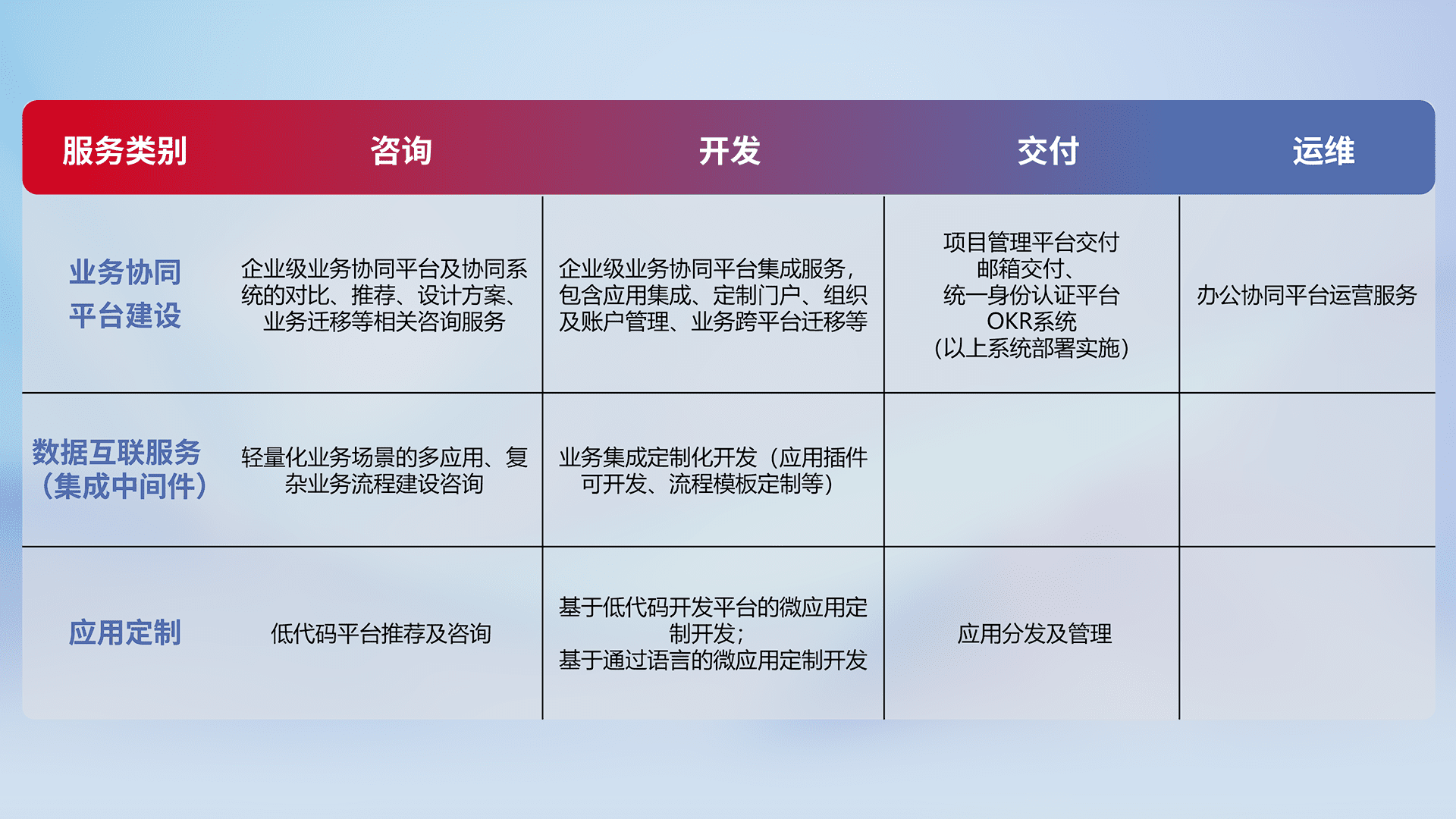 针对钉钉、、、企微、、IDaas等平台级产品提供产品的规划、、、方案、、交付、、定制化开发等服务,,,,实现如统一协同办公、、智能客户服务、、、、混合会议管理、、智能数据查询、、、、等业务场景,,,实现数字化转型。。。。